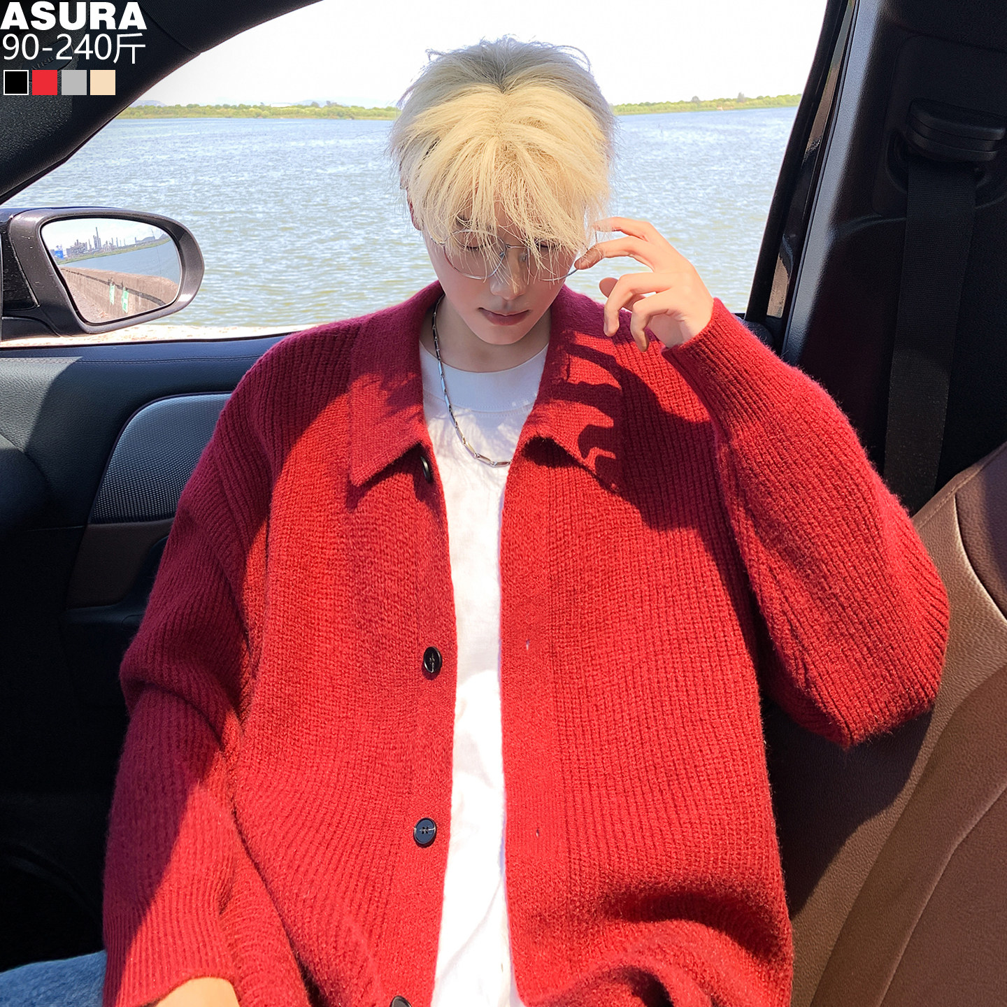 翻领纯色针织毛线衣开衫男加肥大码潮胖宽松外套秋季韩版情侣慵懒