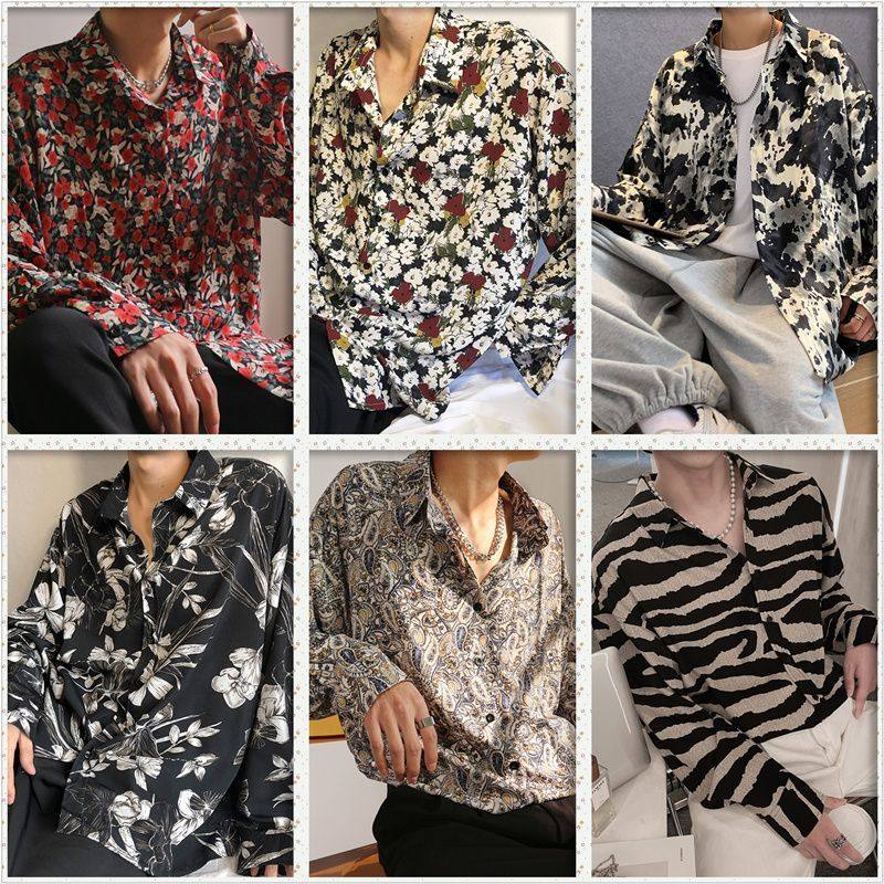 秋季古着vintag12复古薄款长袖衬衫男韩版潮流港风情侣花衬衣外套