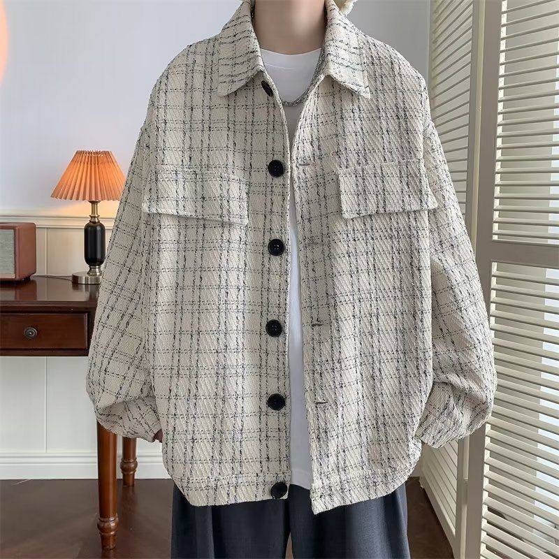 春秋季港风小香风外套男生韩版潮流宽松格子衬衫百搭情侣翻领夹克