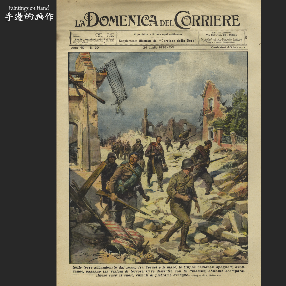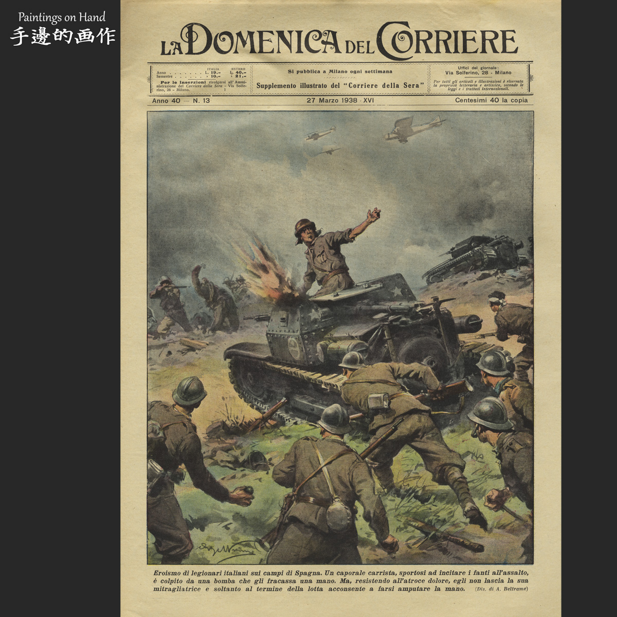 二战意大利1938年古董大幅胶印平印原版收藏/西班牙战场上的英雄