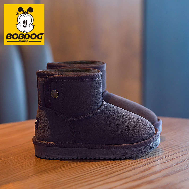 巴布豆儿童雪地靴真皮加绒保暖男童短靴子冬季新款防滑女宝宝棉鞋