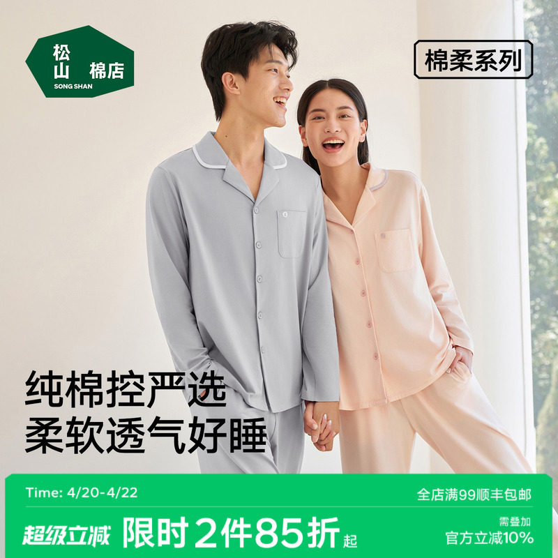 松山棉店棉柔男士开衫长袖家居服套装柔软春夏透气纯棉睡衣女情侣