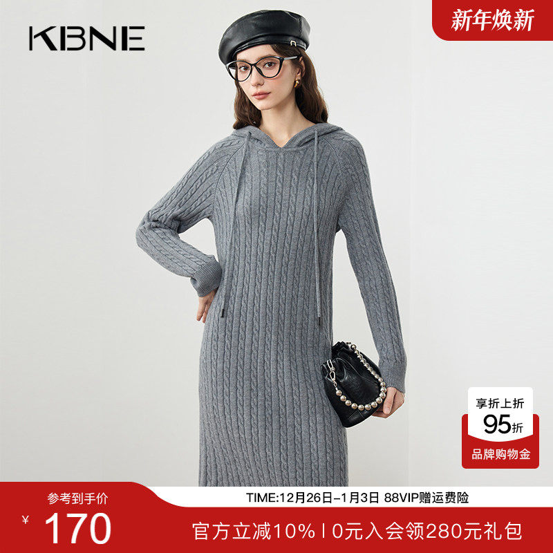 KBNE灰色长袖针织连衣裙女修身中长款气质秋冬新款显瘦连帽毛衣裙