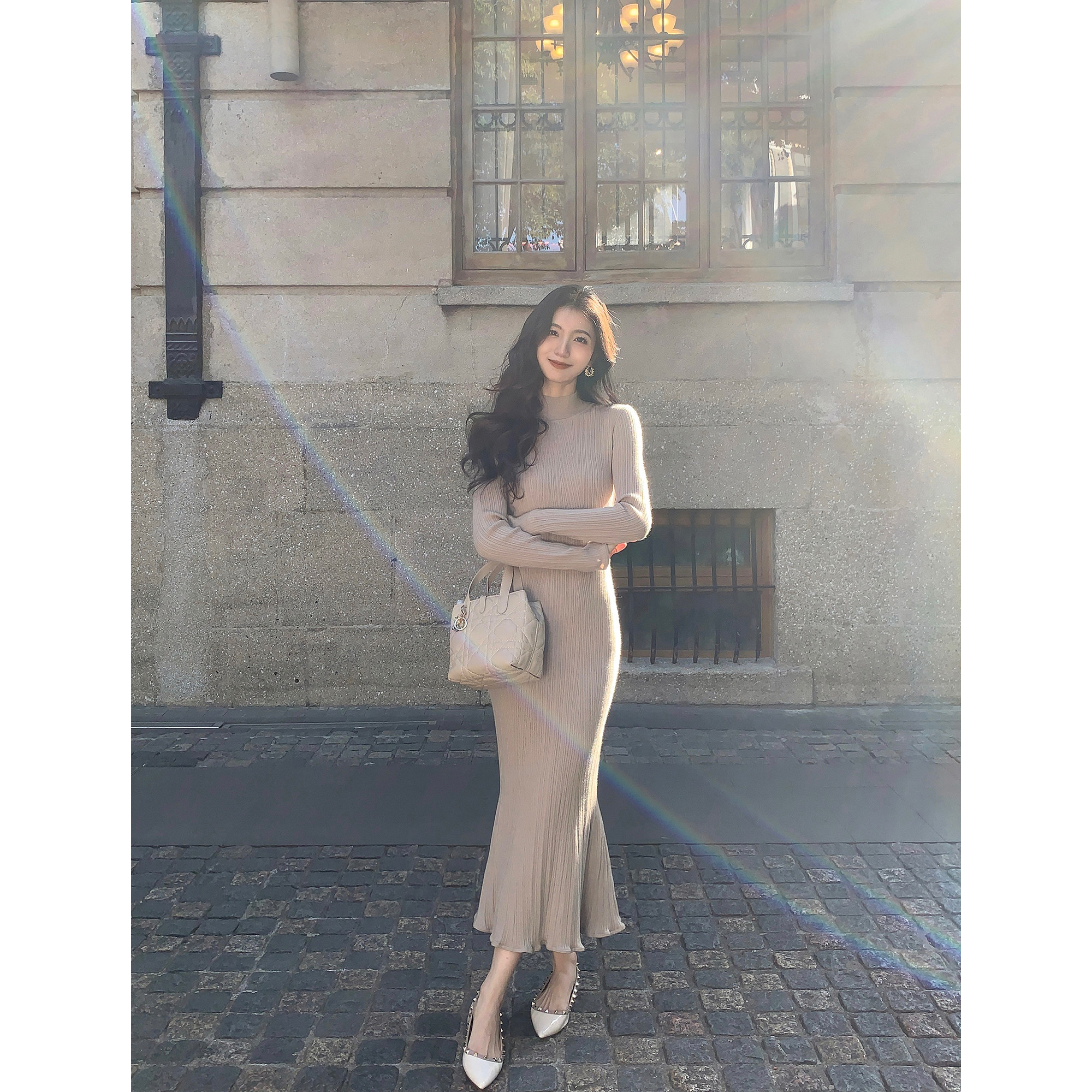松本秋季新款修身显瘦高级感长袖中长款针织打底鱼尾连衣裙女丧丧