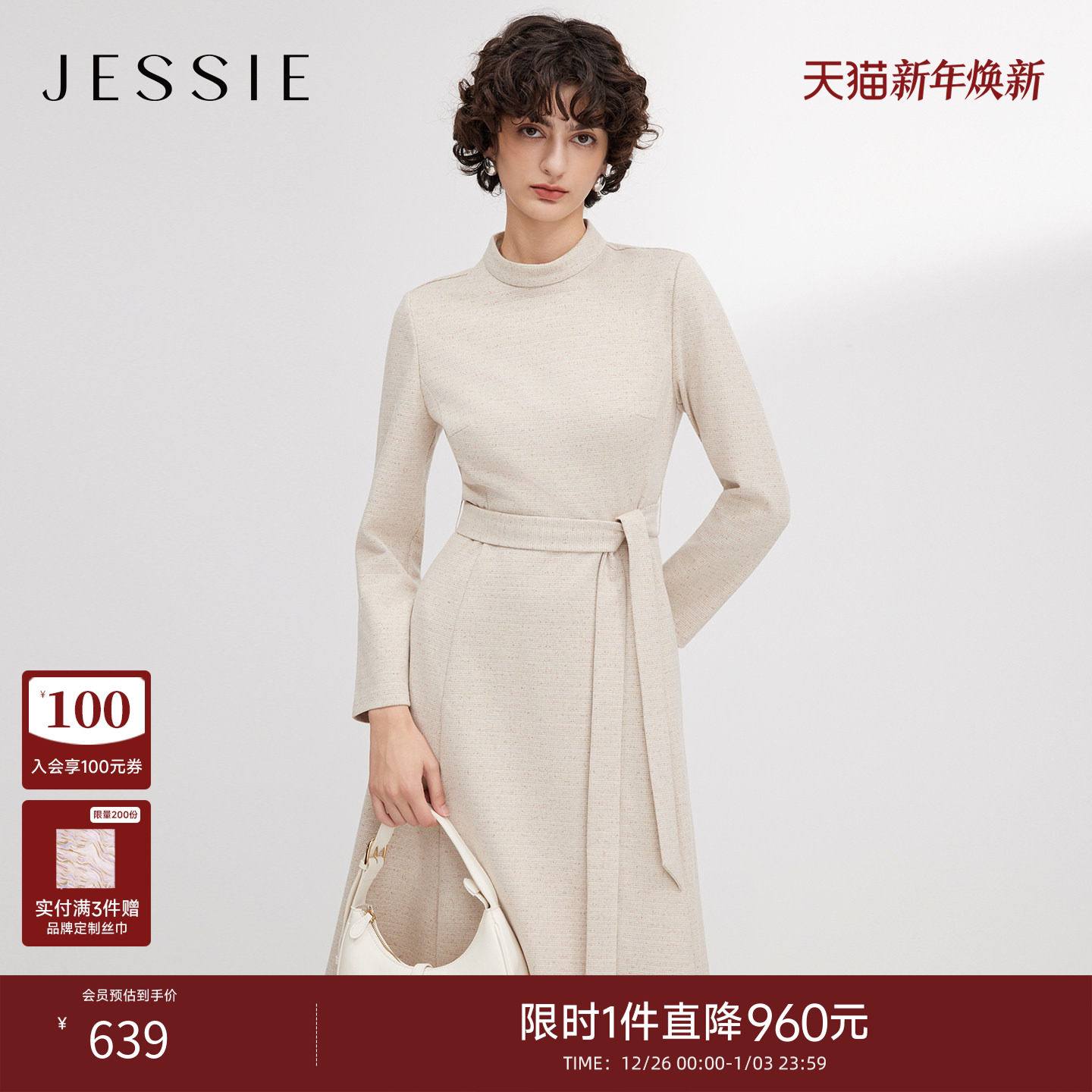 JESSIE粗花呢修身连衣裙女针织花纱立领系带束腰中长裙25年冬新款