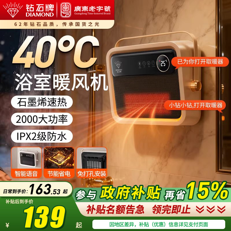 钻石牌取暖器浴室暖风机浴霸挂壁式办公暖手神器桌面取暖电暖挂墙