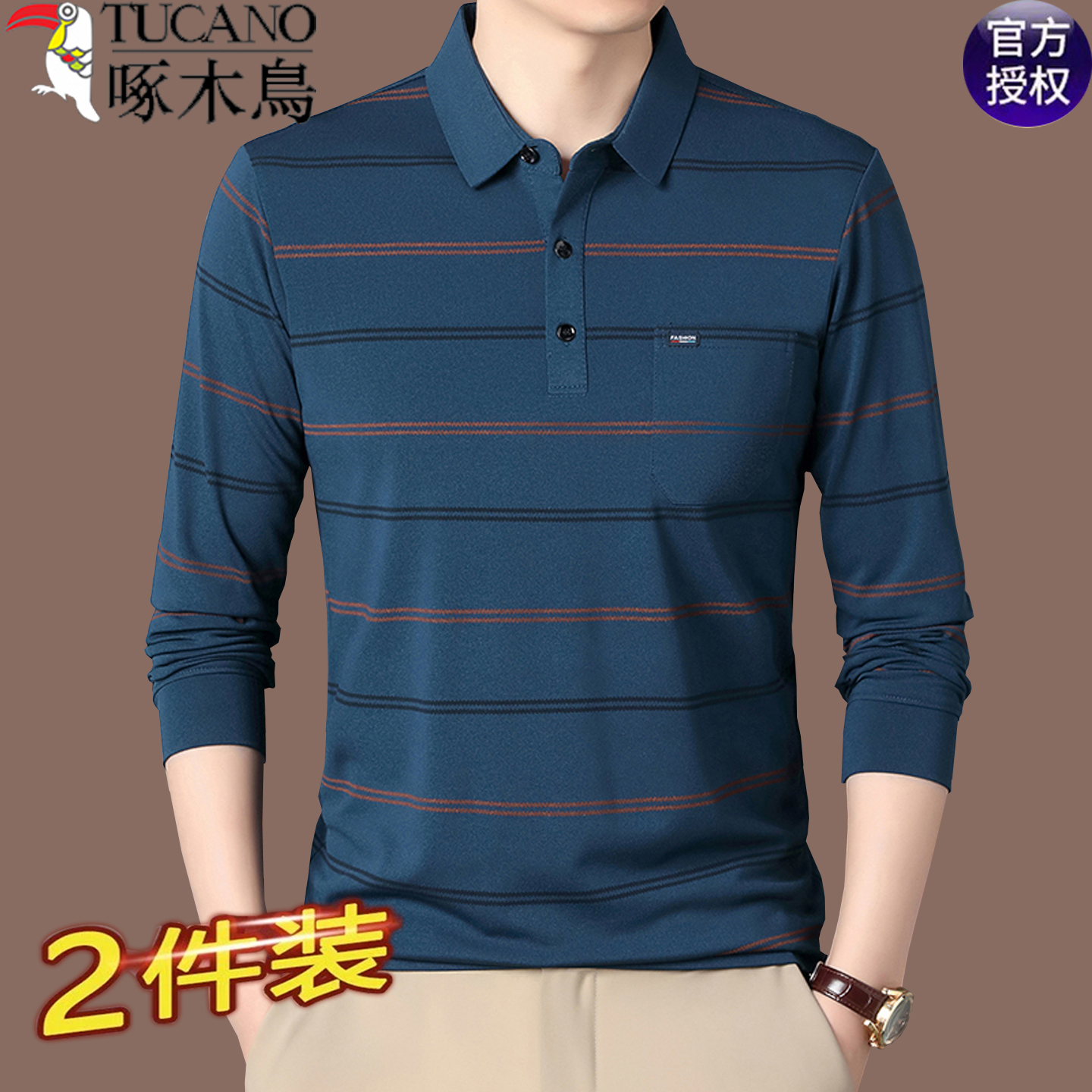 啄木鸟春秋长袖T恤中老年男翻领宽松爸爸装条纹有口袋体恤polo衫