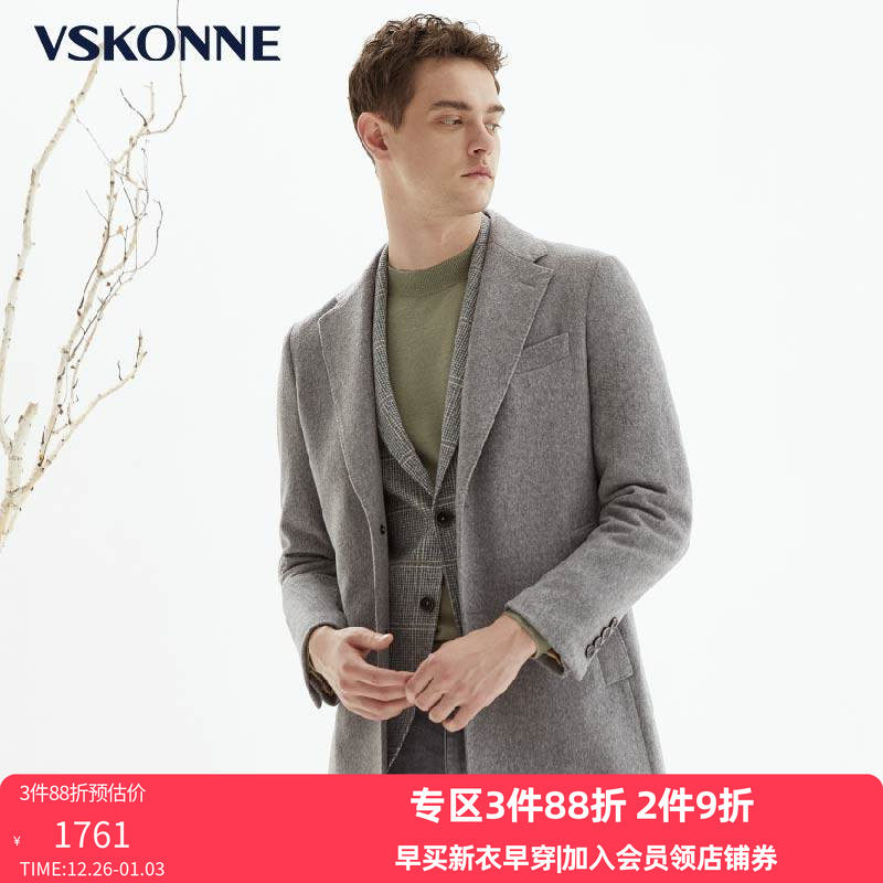 VSKONNE威斯康尼男毛呢大衣100%羊毛高级灰中长款修身呢大衣外套