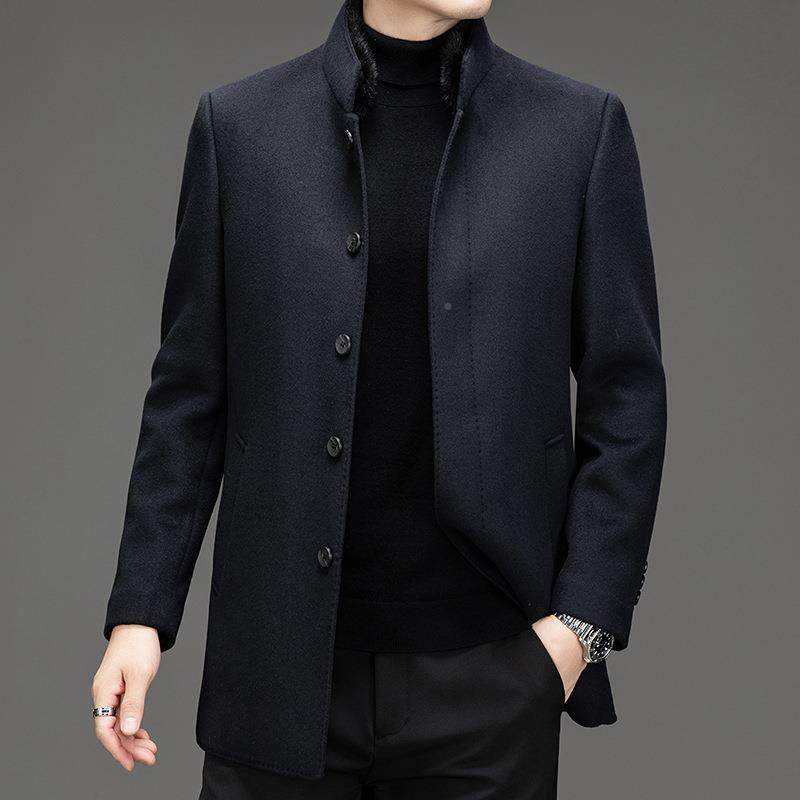509-WL老年厚款男毛呢大衣中长款立领中羽冬绒士内胆秋双面呢外套