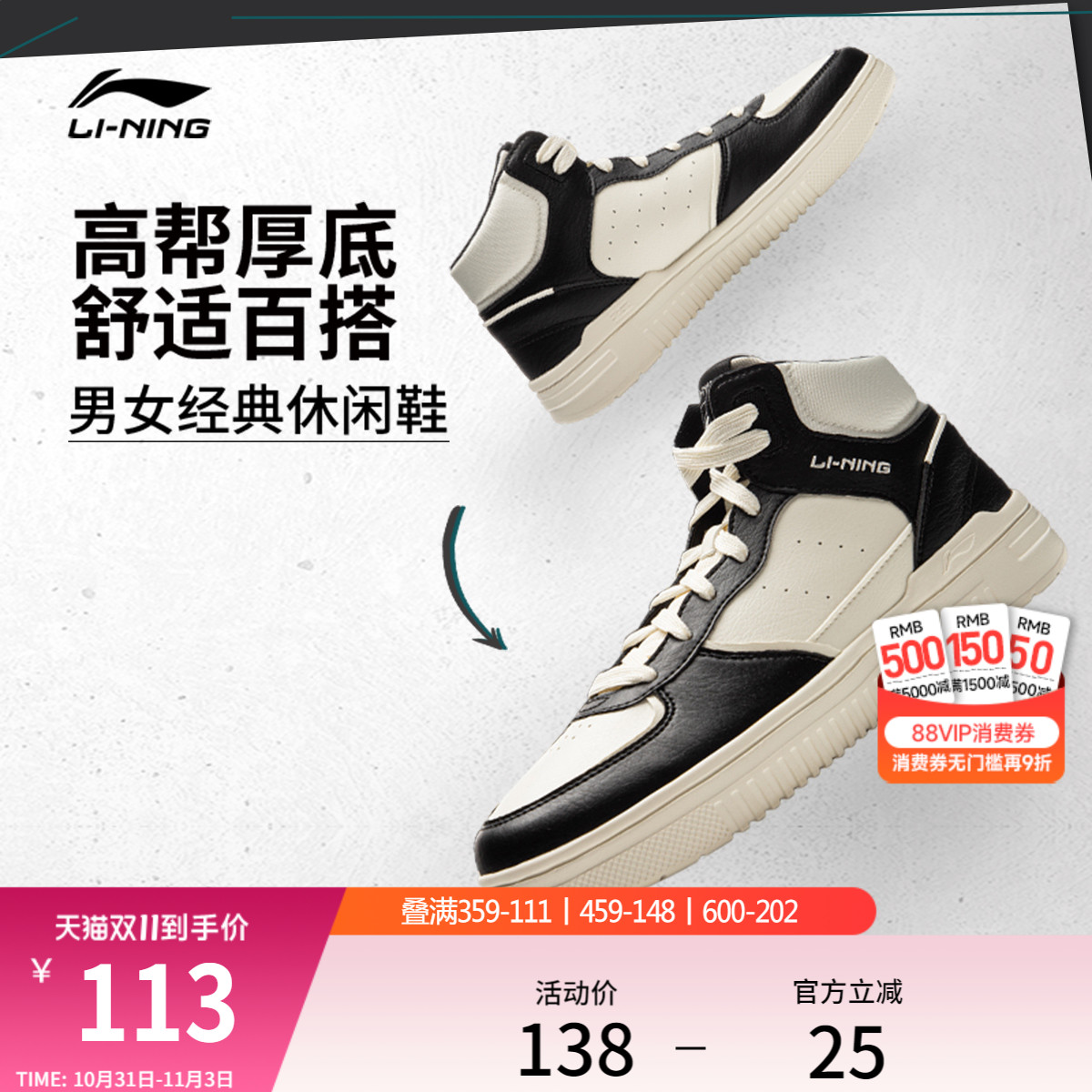 李宁青云Hi丨休闲鞋男鞋冬季厚底增高板鞋黑白复古高帮运动鞋男款