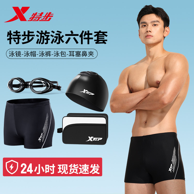 特步男士泳裤男款成人防尴尬2024新款专业游泳裤泳帽泳镜三件套装