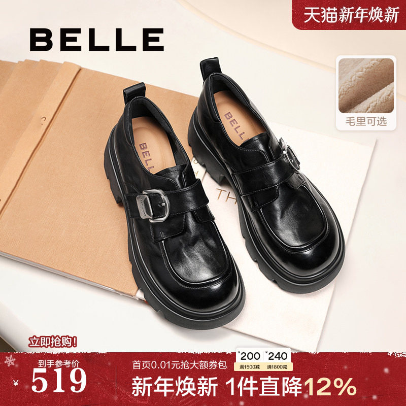 张凌赫推荐百丽黑巧乐福小皮鞋厚底25女复古英伦风黑色毛毛单鞋子