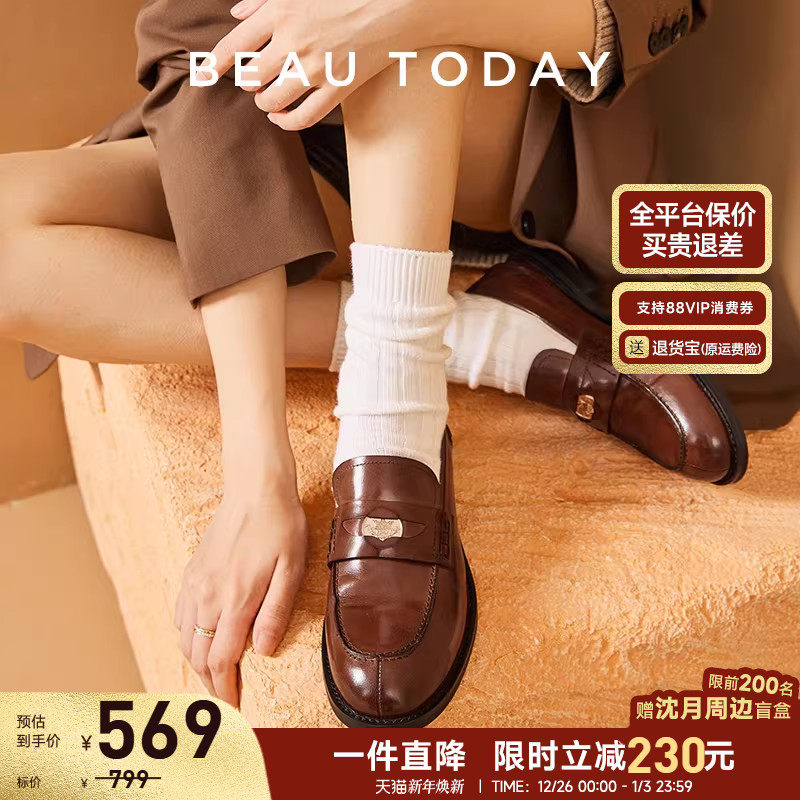 BeauToday焦糖金币乐福鞋女2025新款复古平底单鞋女英伦风小皮鞋