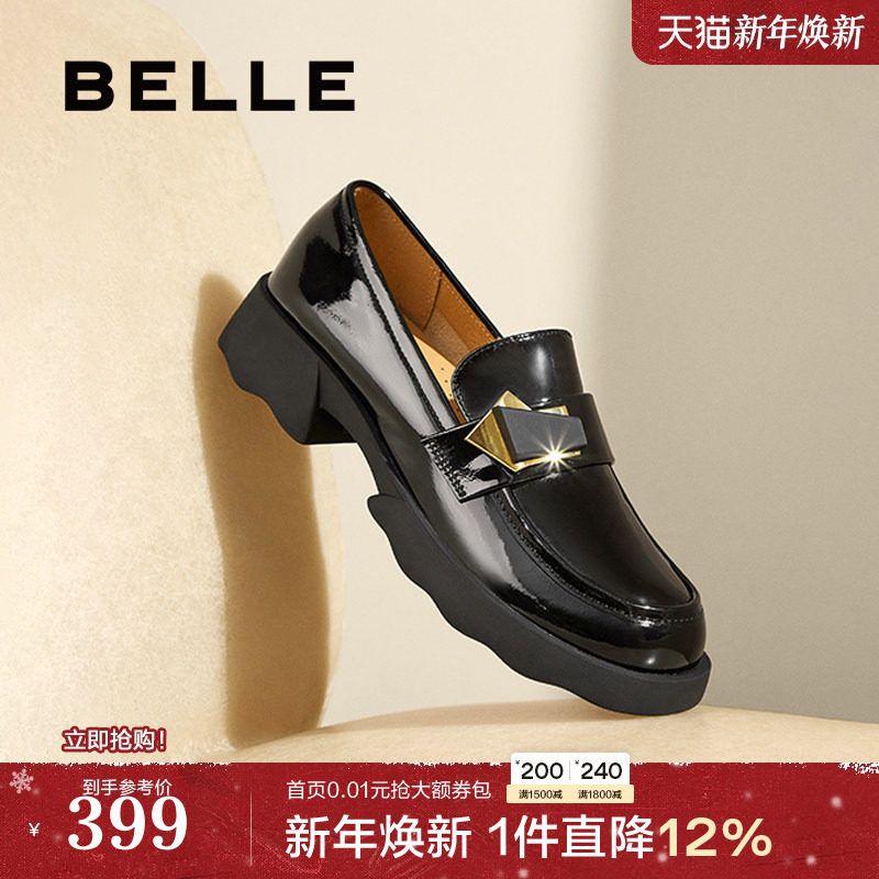 百丽女鞋子25新款英伦风深口单鞋复古黑色小皮鞋乐福鞋B7X1DAA5