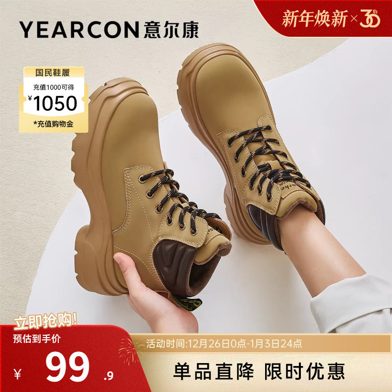 意尔康女鞋冬季复古户外休闲加绒马丁靴粗跟英伦风短靴大黄靴女士
