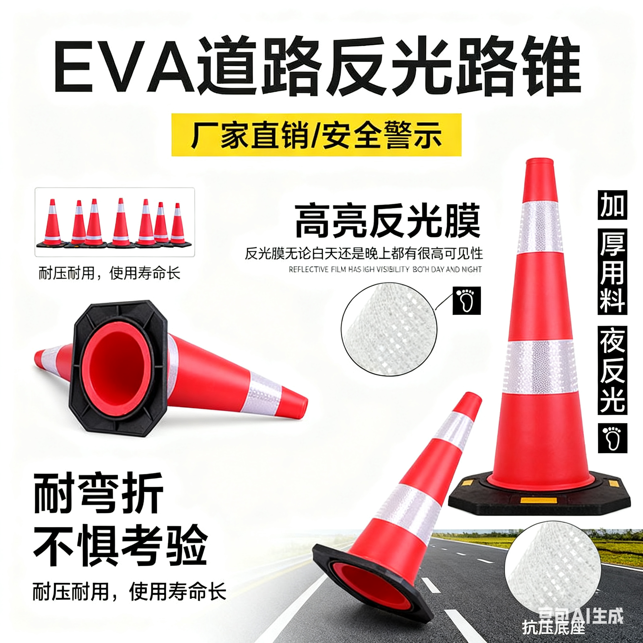 EVA反光锥桶90cm高速路障锥隔离锥筒交通设施90公分锥桶橡胶路锥