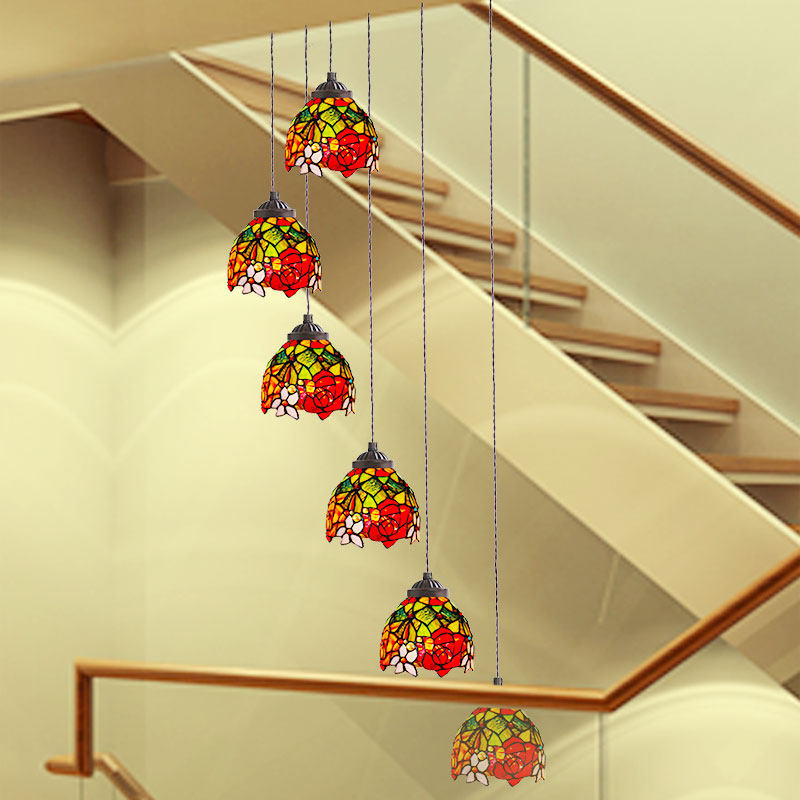 复式楼梯吊灯豪蒂玫瑰彩玻欧美复古大气奢华复式楼梯别墅旋转吊灯