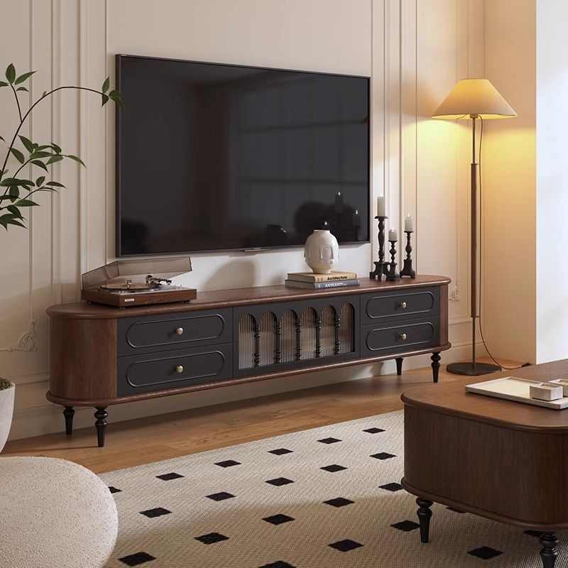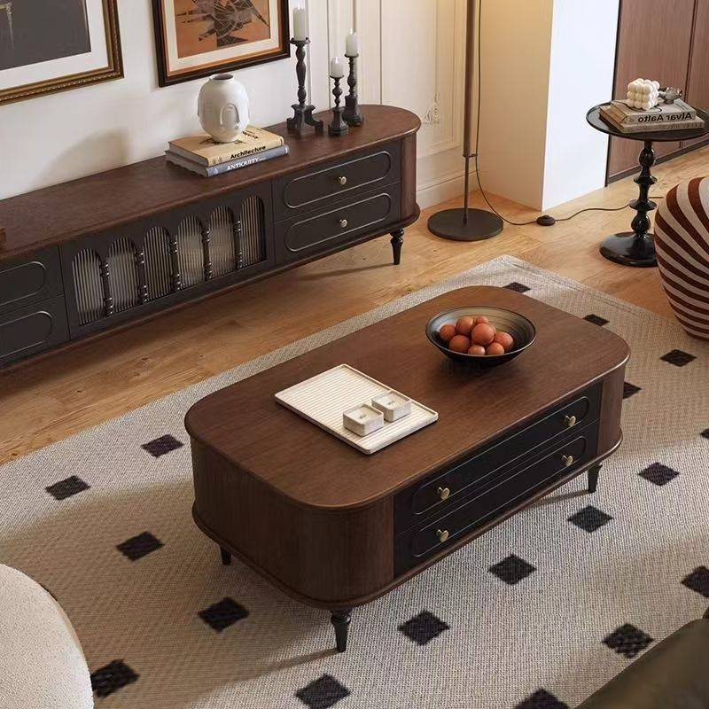 法式复古实木电视柜胡桃加黑色美式客厅茶几电视柜组合落地储物柜