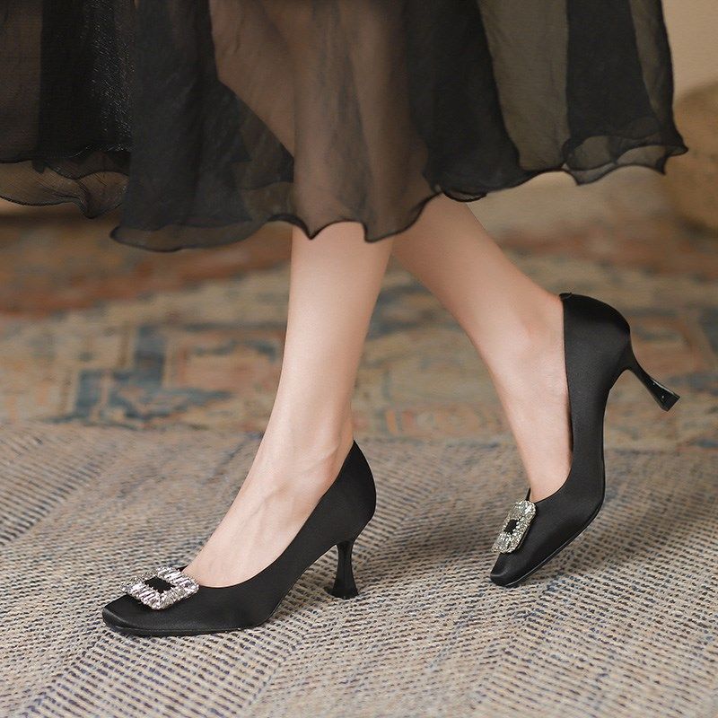 气质缎面职业黑色高跟鞋女细跟2025夏季新款尖头浅口水钻中跟单鞋