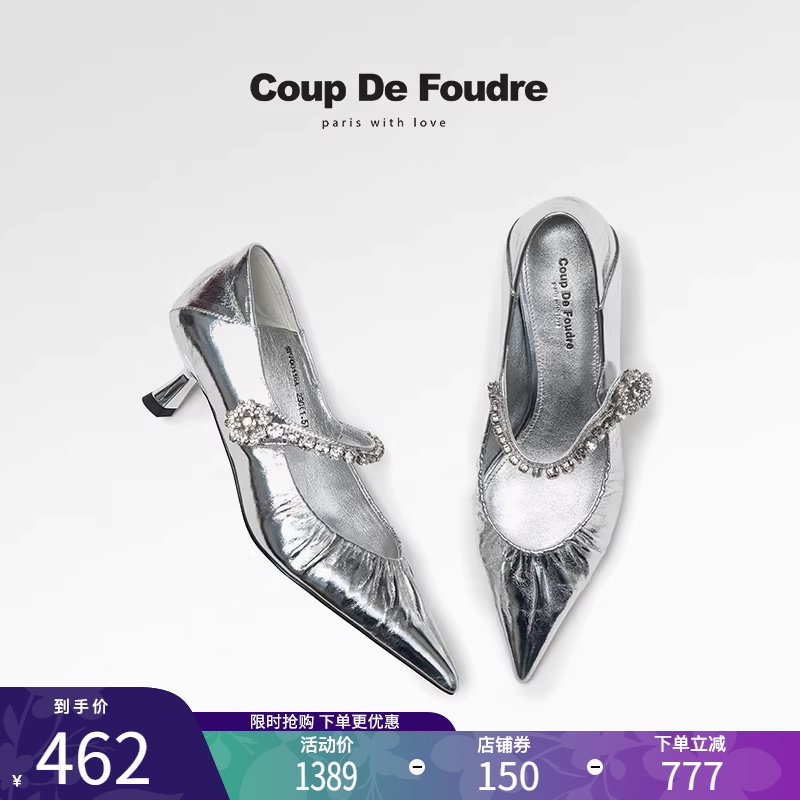 CDF女鞋轻奢秋季法式百搭真皮法式尖头中跟浅口水钻银色名媛单鞋