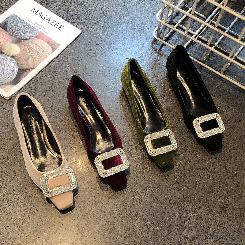 法式名媛水钻扣气质中跟单鞋2025年春季新款方头浅口丝绒粗跟瓢鞋