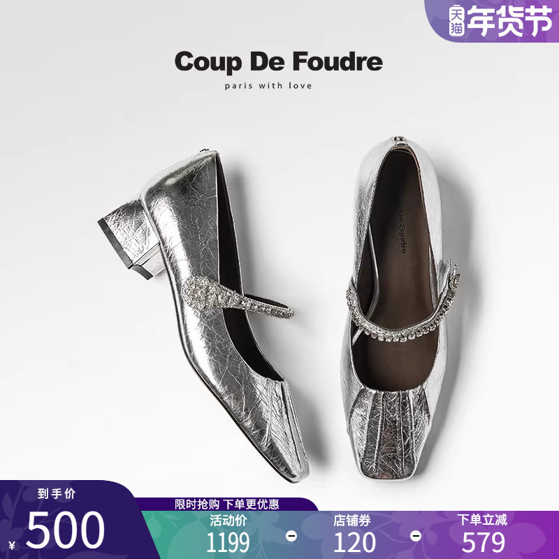 CDF女鞋轻奢秋季新款百搭真皮浅口中跟单鞋水钻优雅银色玛丽珍鞋