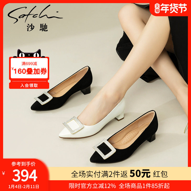 沙驰女鞋水钻方扣职业单鞋女2025年春季新款舒适粗中跟尖头通勤鞋