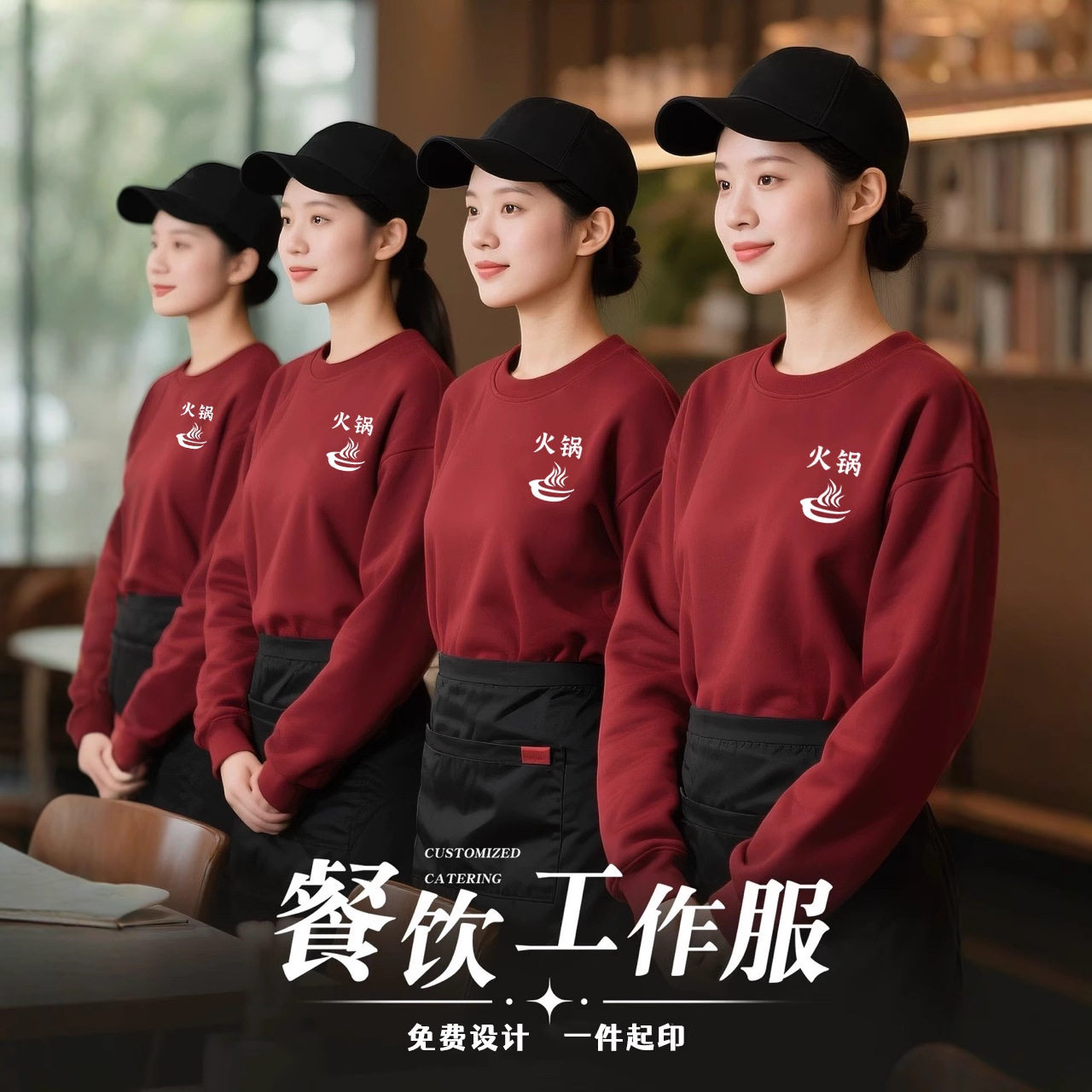 餐饮服务员工作服长袖卫衣定制秋冬季饭店烧烤火锅店员工装印logo