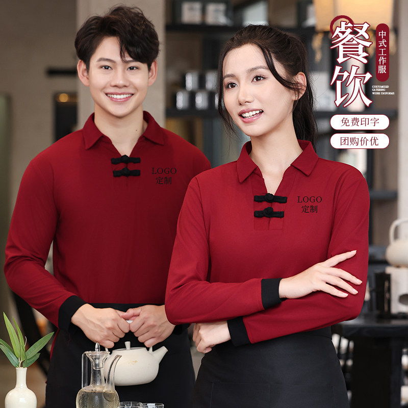 餐饮服务员工作服长袖女中国风秋冬餐厅酒店火锅店烧烤店t恤定制