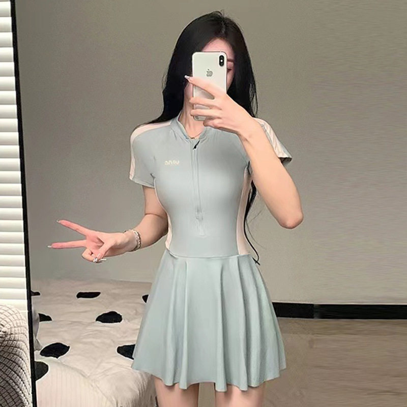 韩国ins夏季新款简约保守修身显瘦拉链运动裙式连体平角泳衣泳装