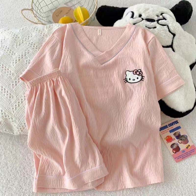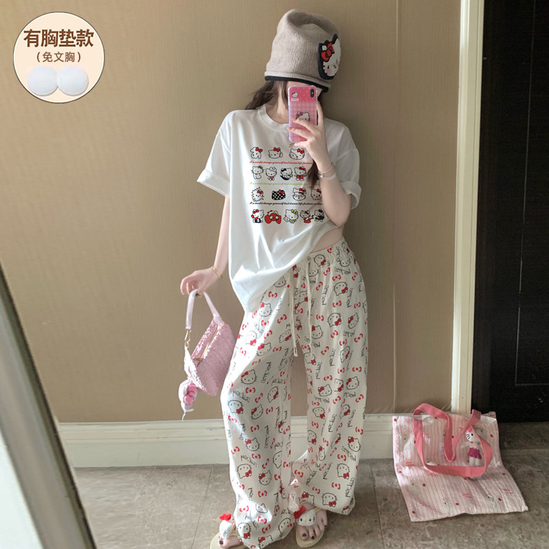 可爱KT猫睡衣女款夏带胸垫纯棉2025新款短袖长裤家居服薄款可外穿