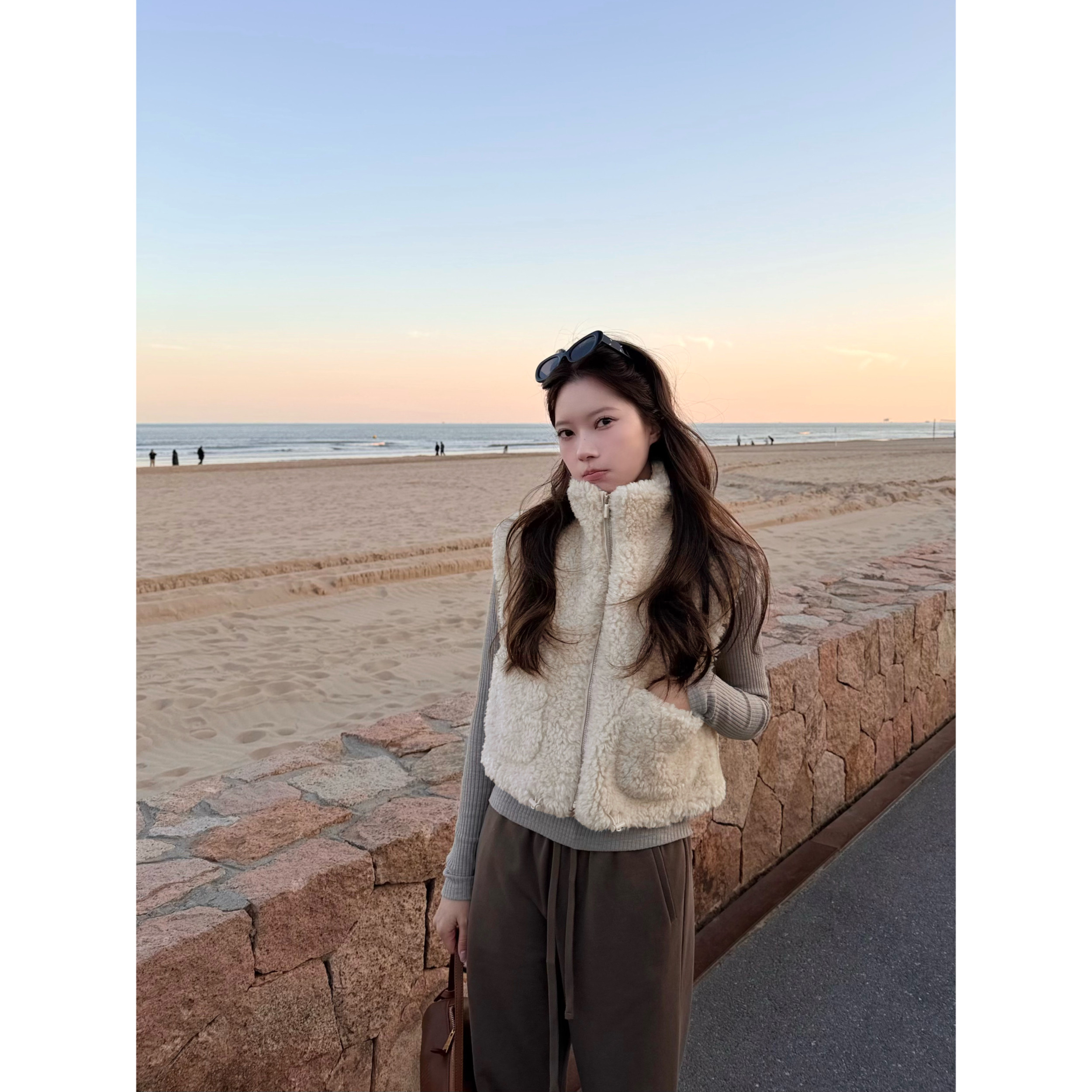 温柔好看的烟灰色毛茸茸感麂皮内胆立领保暖羊羔绒马甲/马夹外搭