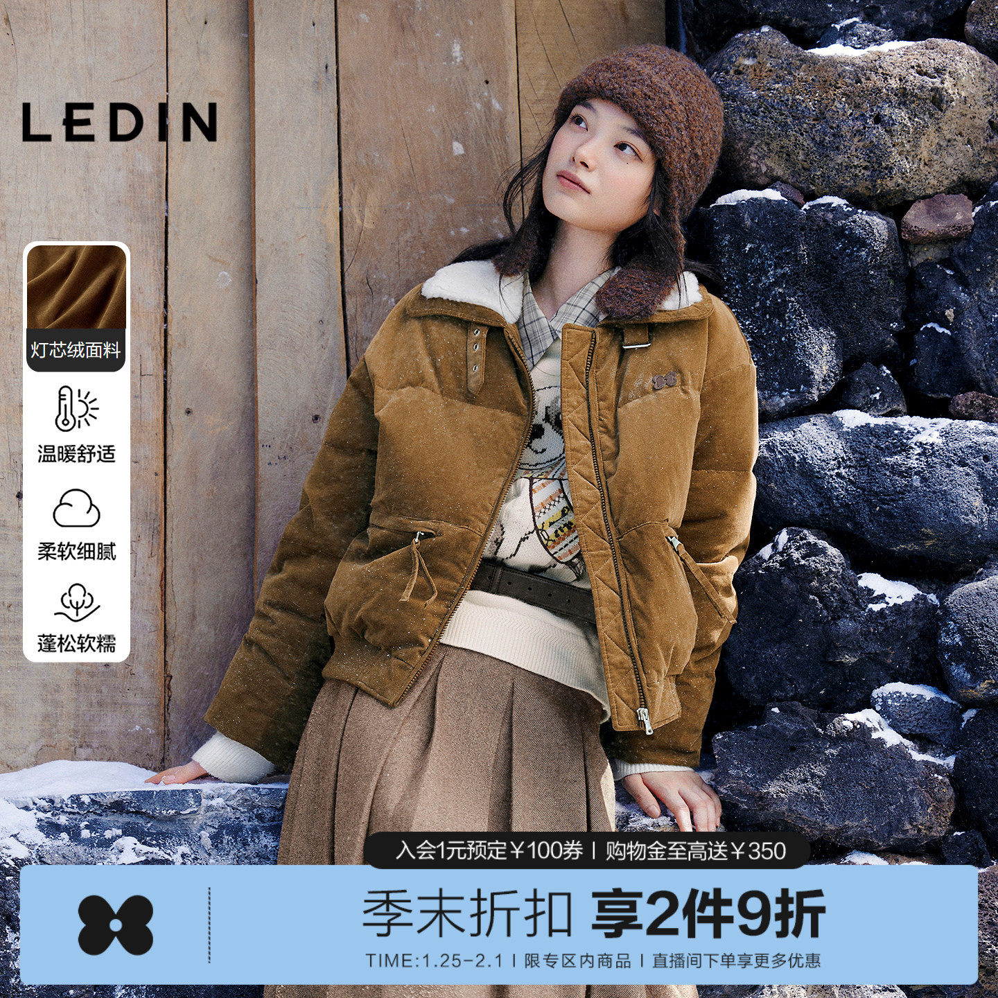 乐町美拉德灯芯绒仿羊羔毛短款羽绒服女装25冬季新款短款保暖外套