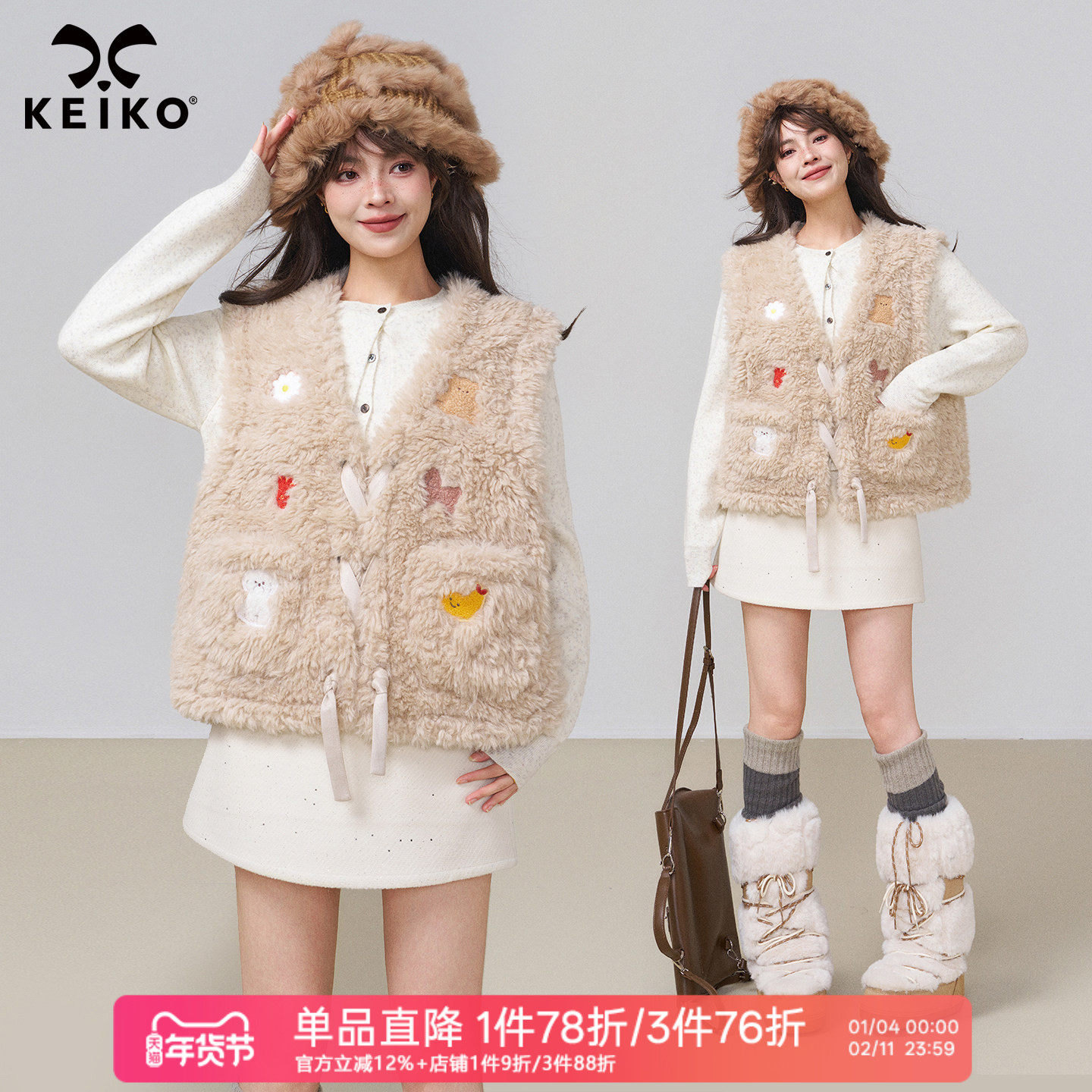 KEIKO 卡通绣花羊羔毛绒马甲外套秋冬叠穿环保皮毛一体坎肩小背心