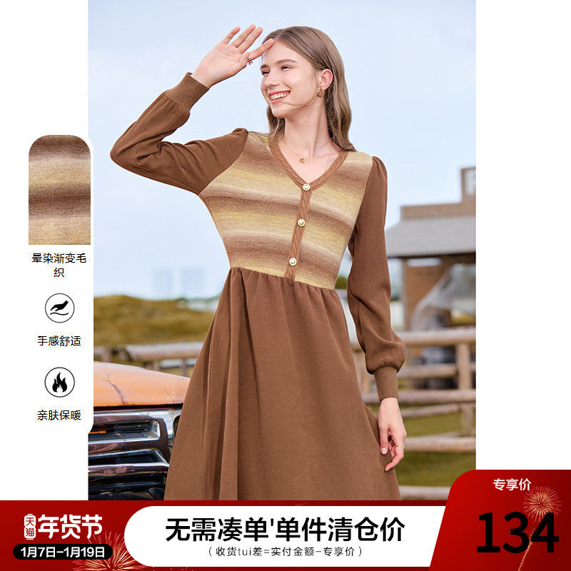 betu百图美拉德拼色V领针织连衣裙2025年秋季新款高腰显瘦中裙