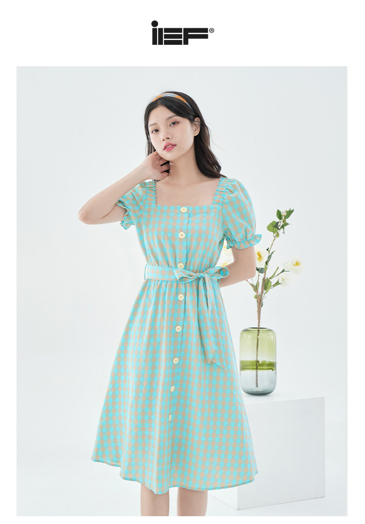 酷伽韩版新款中裙法式复古格子短袖修身抽绳设计高腰连衣裙7116