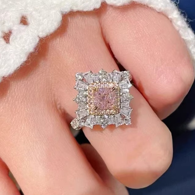 Young珠宝定制粉色彩钻鹅蛋形微镶粉钻戒指 优雅仿真钻石戒婚戒女