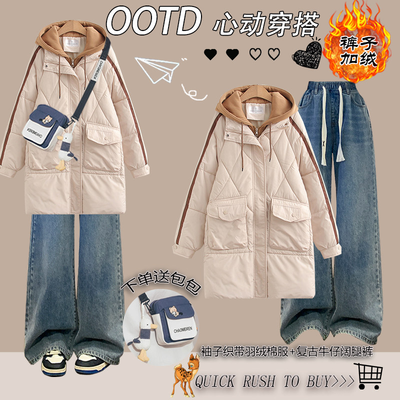 中长款羽绒棉服女2025冬装新款初高中学生假两件连帽加厚棉衣外套