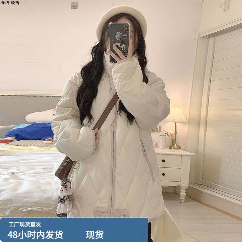 高领菱格棉衣外套冬宽松时髦少女初中高中学生轻薄中长款羽绒棉服