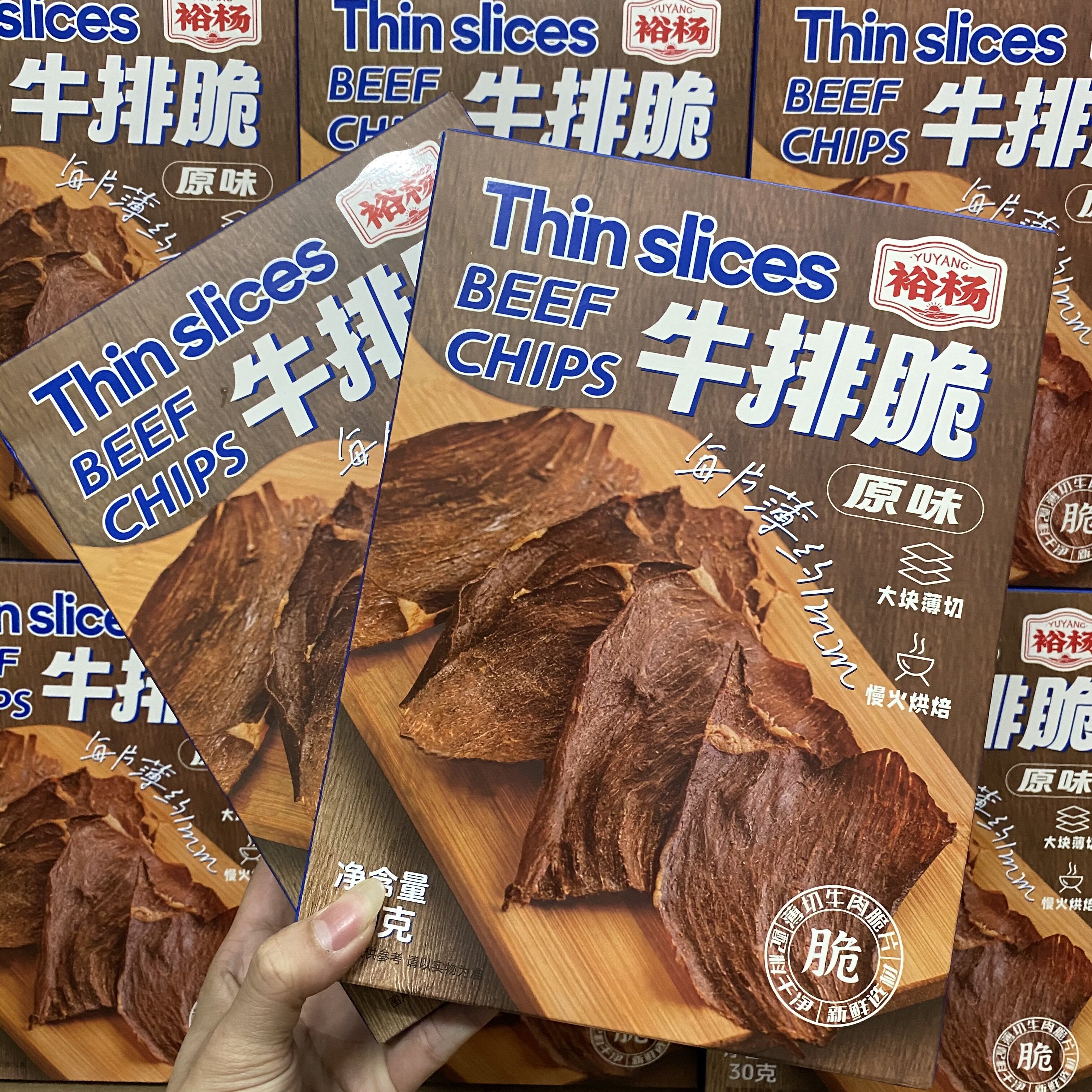 裕杨牛肉干薄片零食香脆慢火原味牛排脆30g/盒装大片薄切牛肉脆片