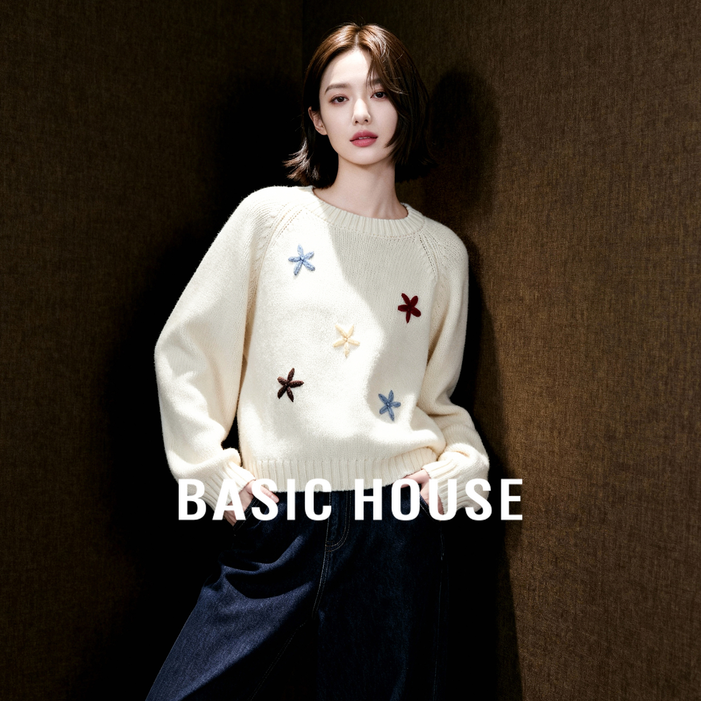 Basic House/百家好花朵刺绣毛衣慵懒风女25秋冬新款圆领软糯上衣