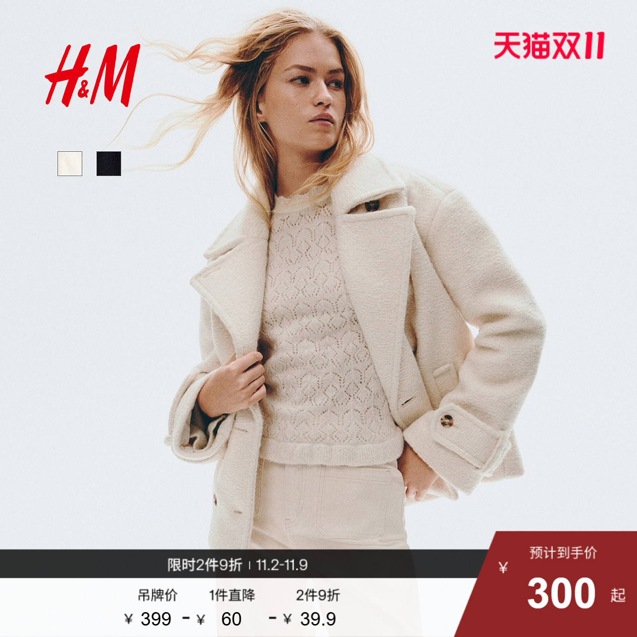 HM女装毛呢外套2025秋冬新款双排扣短款宽松翻领毛绒大衣1301400