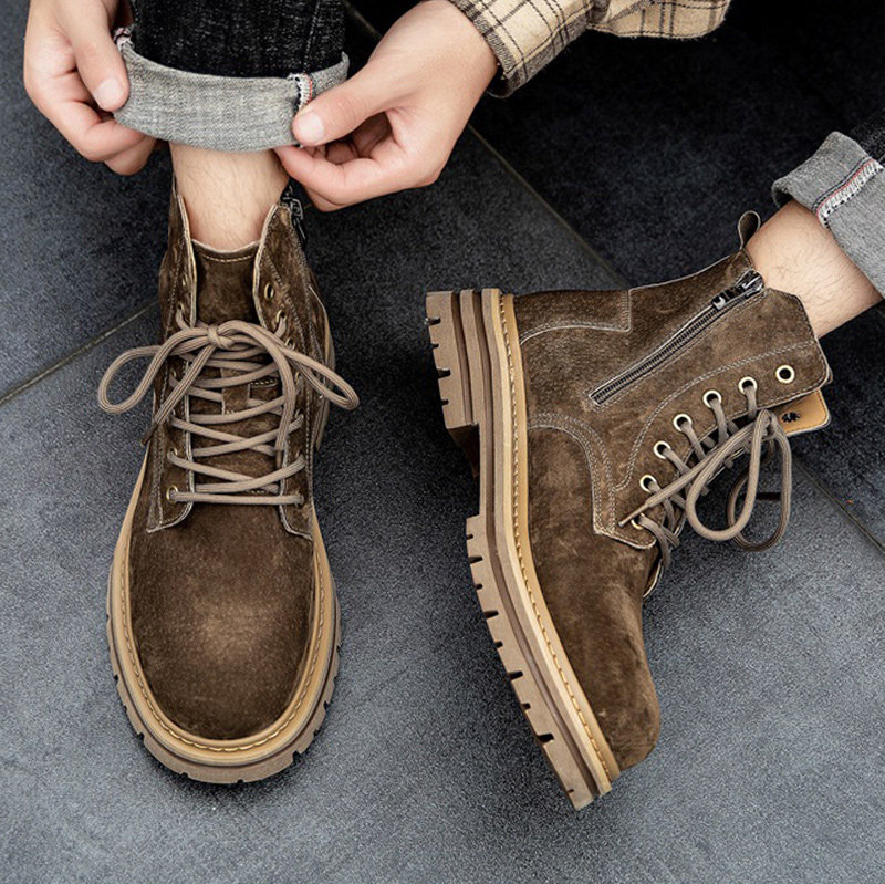 高帮鞋男秋冬复古保暖毛靴时尚系带个性马丁靴防滑户外登山工装靴