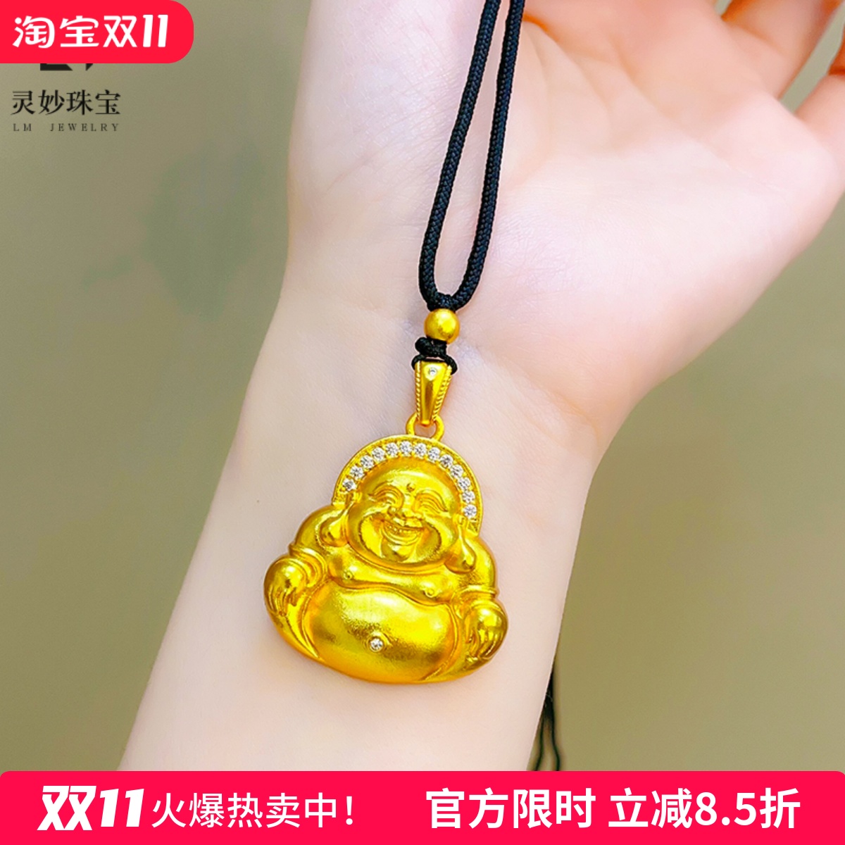金店同款沙金999古法点钻大肚弥勒佛笑佛项链吊坠实心男女情侣款