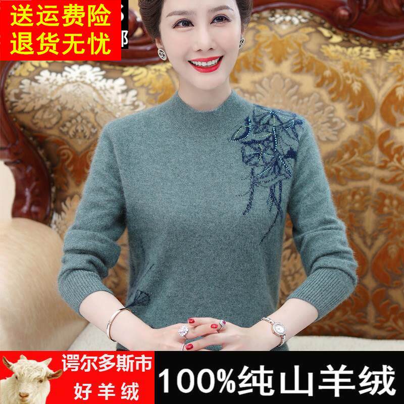 鄂尔多斯市羊绒衫女秋冬新款印花中老年妈妈装羊毛针织毛衣打底衫