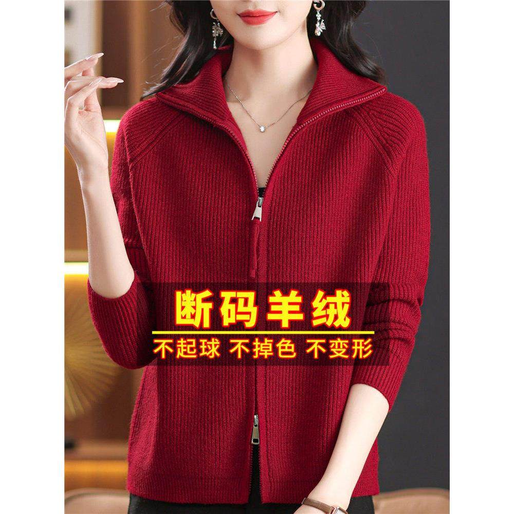 鄂尔多斯市羊绒针织开衫女春秋冬红色毛衣外套双拉链外搭时尚上衣