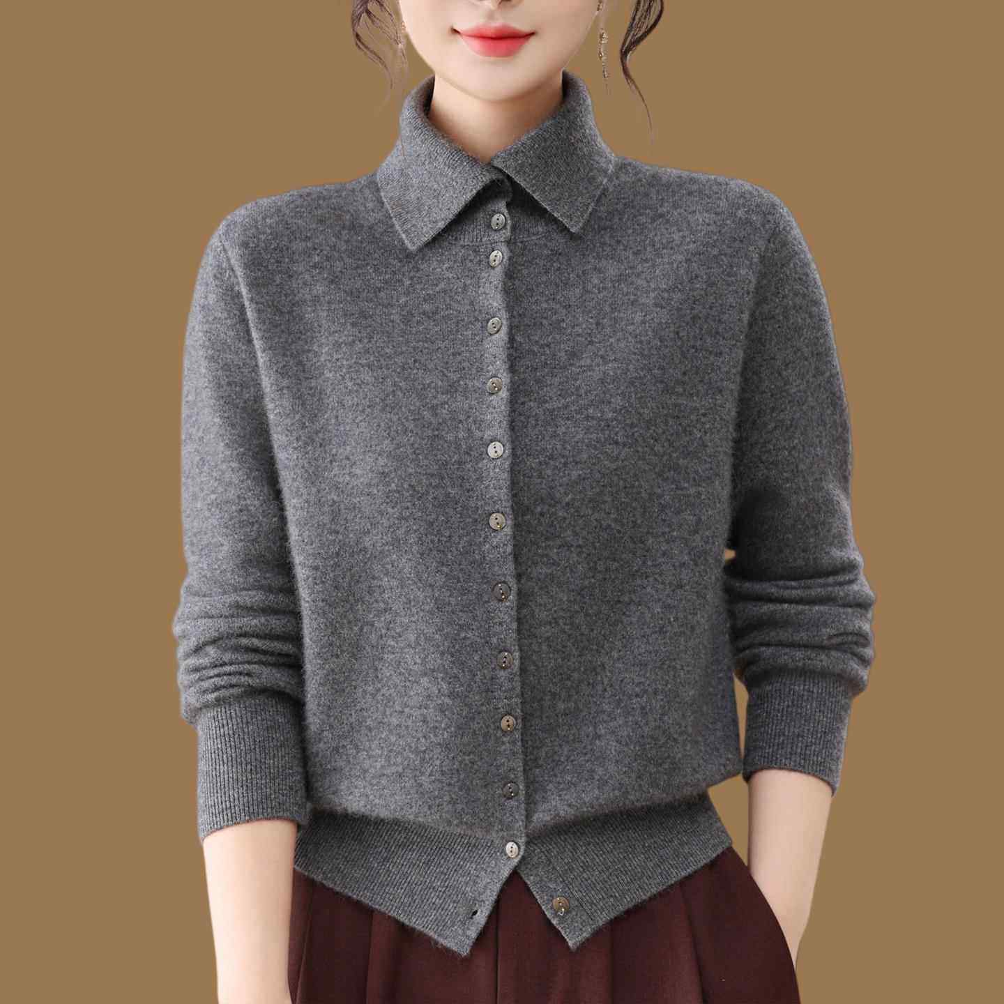 鄂尔多斯市老钱风翻领100%纯羊绒针织开衫女秋冬百搭气质毛衣外套