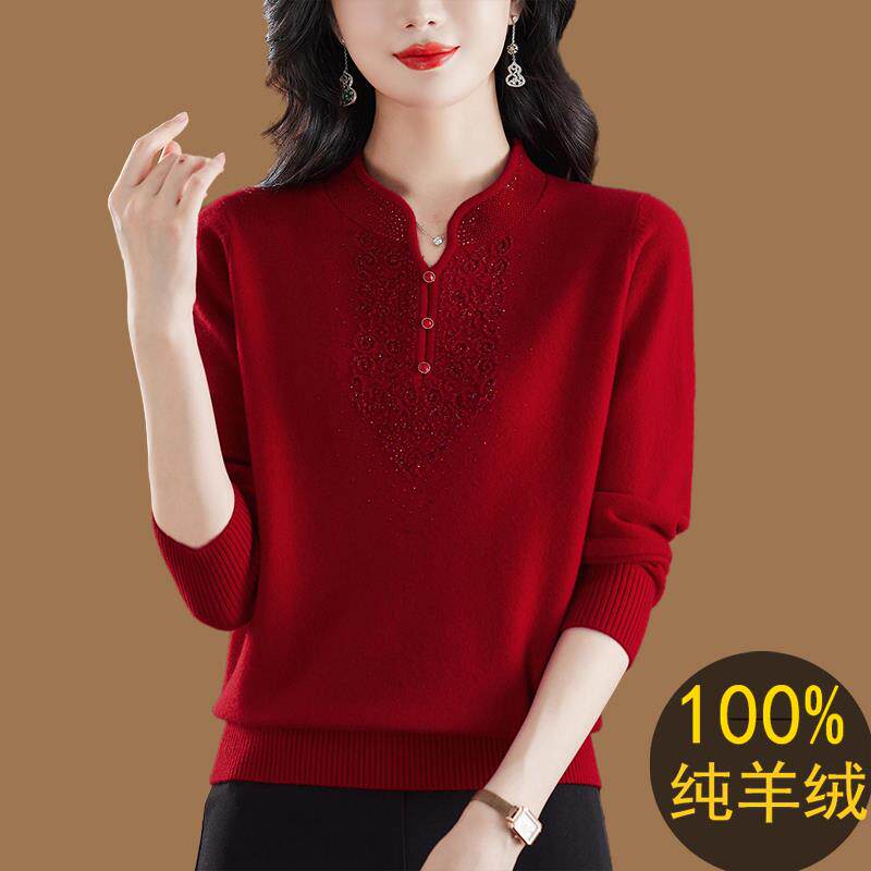 鄂尔多斯产羊绒衫女红色v领中老年女装套头打底衫妈妈款秋冬毛衣