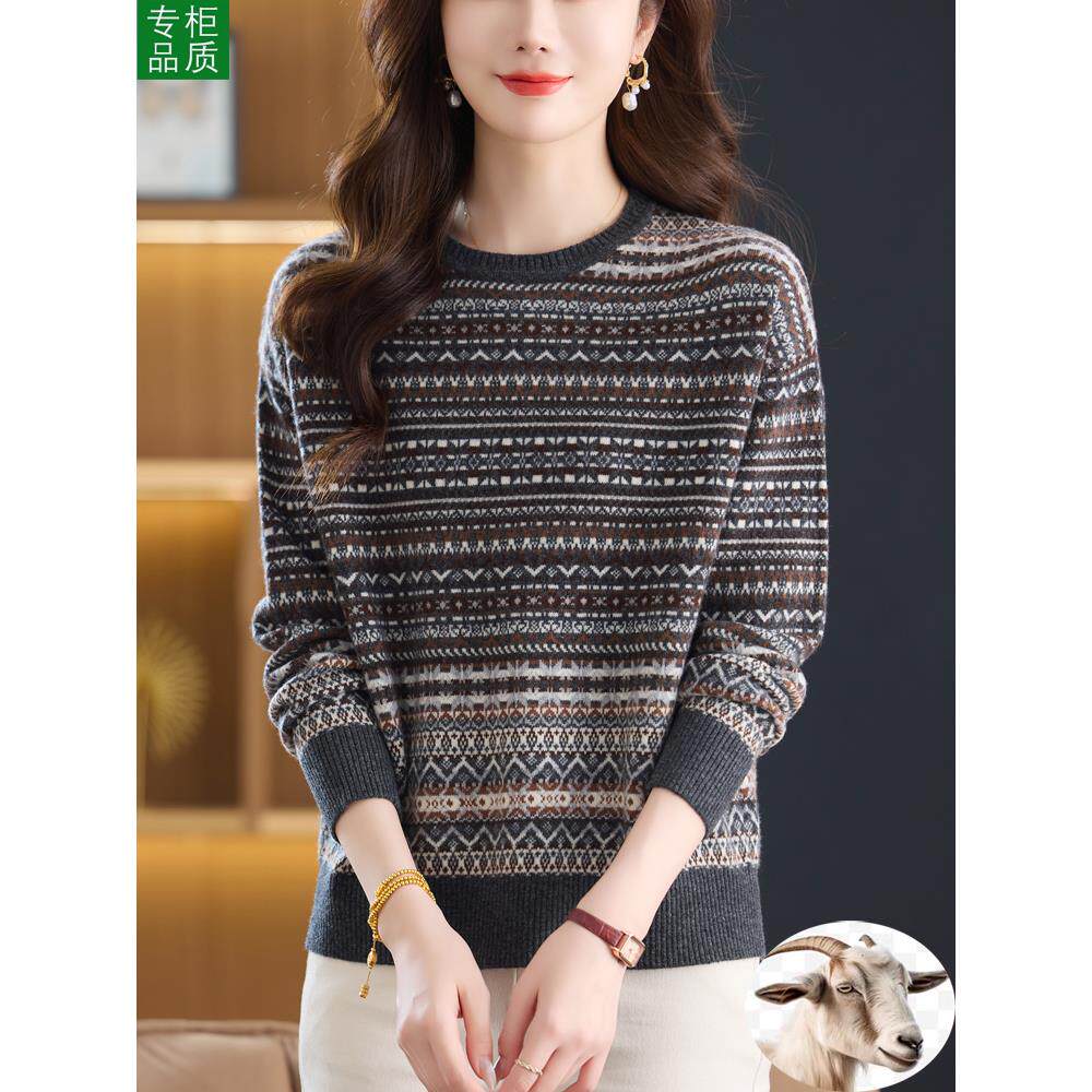 鄂尔多斯市圆领羊绒衫女100纯羊毛打底衫新款条纹覆古毛衣女秋冬