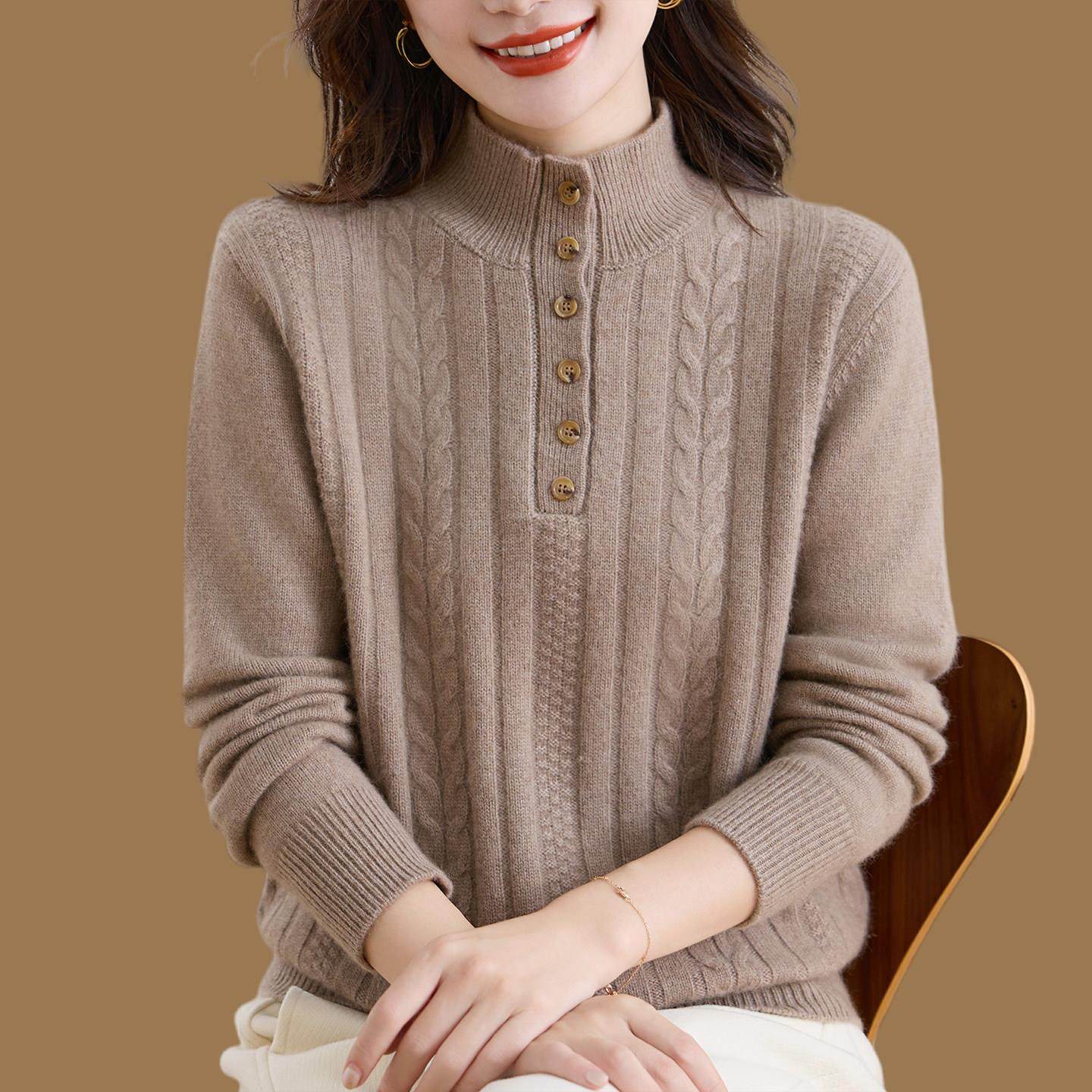 鄂尔多斯市高端100%纯羊绒衫女新款妈妈装麻花半高领毛衣加厚打底